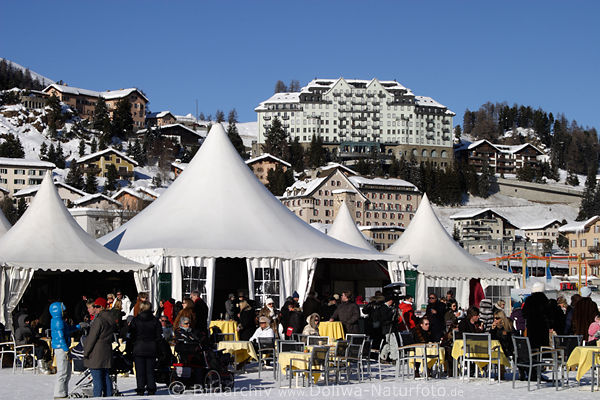 Polo auf Schnee buntes Treiben Panoramafoto vor Häuser & Hotels der Schweizer Stadt in Engadin