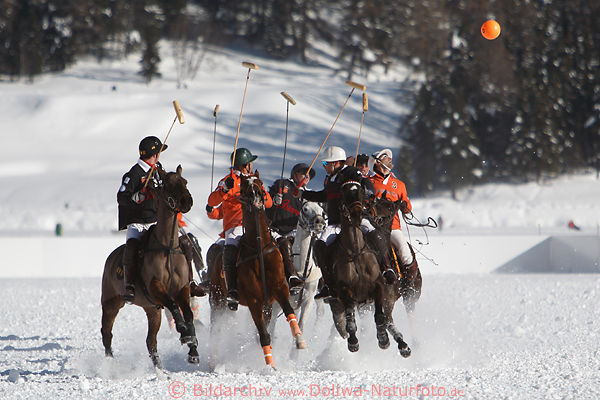 Polokampf Emotionen Aktion Sportbild in Galopp mit Polosticks auf zugefrorenem Schweizer See beim Weltcup