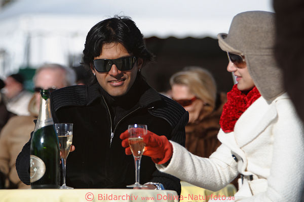 Indiens Akteure Filmszene Drehen von Kinofilm zwischen Polobesucher. Indisches Bollywood ist florierende indische Filmindustrie, die keine Kosten scheut für ihre Film-Produktionen, investiert große Summen, und dreht Filme auf bekannten Orten der Erde, wie hier in Sankt Moritz, anlässlich des lägenderen Poloevents beim Promi-Treff in Fotografie. Bombay und Madras sind Hauptzentren des Films in Indien, typische Filmart ist ein Liebes-Melodram, mit Musik, Gesang und Tanz. Bollywood Film-scene picture from St. Moritz SnowPolo, India's actors promi charm, man & girl photo, lady faces people glamour in Switzerland