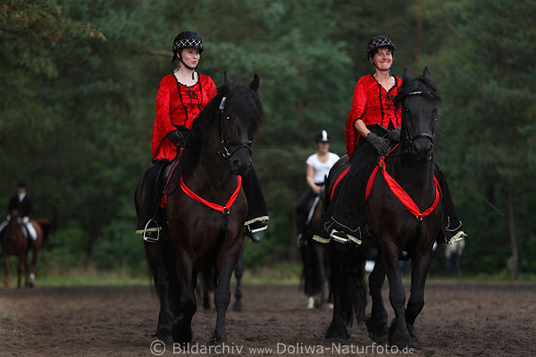Friesenpaar vor Pferdeshow beim Bispinger Reitturnier auf Parcours mit Waldkulisse