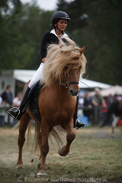 Mädchen, Pferdereiterin präsentiert kleine hübsche Pferderasse Islandpferd mit heller langen Mähne und Schweif Bild galoppierend beim Bispinger Heide Reitturnier Show-Präsentation