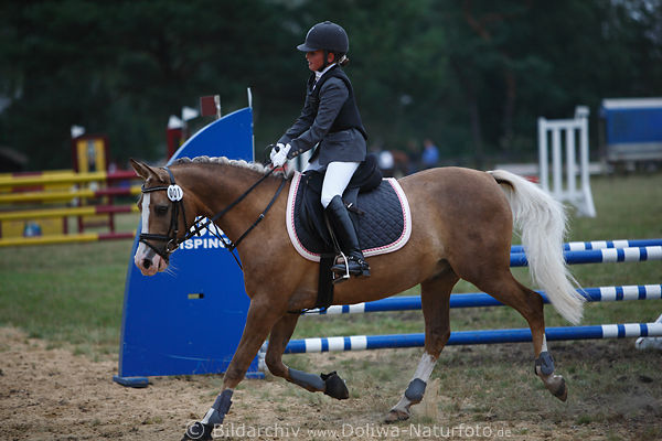 Reitnachwuchs mit braunem Pony vor Hürden bei Reitturnier in Bispingen Springprüfung