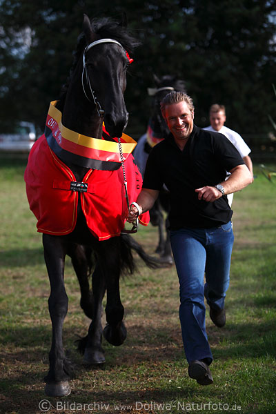 Pferdebesitzer Siegerrunde mit schwarzen 3-jährigen Friesenstute Foto, Friesenporträt nach Sieg am 14. August 2010 auf Friesengestüts in Widukindstraße
