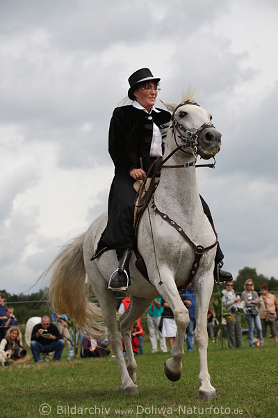 Amazone Seniorin dynamisches Porträt auf Pferd Reiterin im Hut präsentiert Grazie alter Reitkunst Fotografie von Zuchtschaufest am 14. August 2010 auf Friesengestüts in Widukindstraße