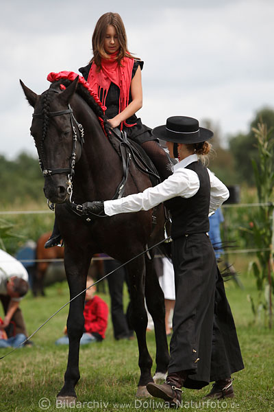 Reiten Pferdeschau Eleganz der Hofreitschule lernen, junge Amazone zu Pferd mit Rotschal präsentiert Reiterkunst Fotografie von Behringer Zuchtschau. Hier ein Link zur Reiterin Pferde & Reitschule