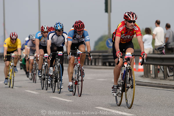 im Freihafen Hamburg Radsport Cyclassics Radtour Strecke. Radsportler mit Rennrad Sportfoto, Radler Sportwettbewerb. Bicycle racing photo