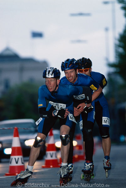 inline Skating Läufer in Bewegung neben fahrenden Autos in Dämmerung, Mann-trio Rollfahrt am Autoverkehr, langlauf, rollen an Verkehrsstraße