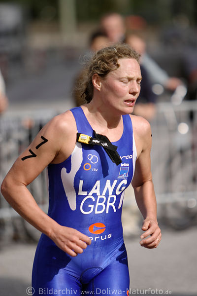 Sportlerin müde, erschöpft, aber kämpferisch, Triathletin Lauffoto, Weltmeisterschaft Rennen Frauenwettbewerb. Ausdauersport Momente in Sportfotoarchiv