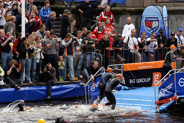 Schwimmerinnen in Alsterwasser & Läuferinnen im Lauf vor Publikumstribüne, Triathletinnen WM 07 Frauenwettbewerb Bild, Extremsport Ausdauersport Fotoarchiv Hamburg Ciy-Man Triathlon Besucher