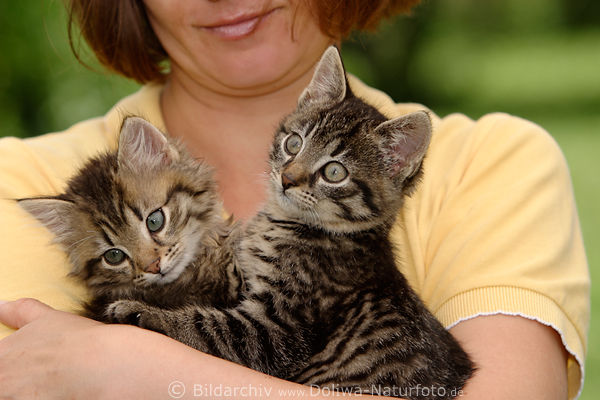 57724. Anschmiegsames Katzenbabies Paar, süsse kleine Kätzchen Kuscheltiere in Armen sitzend kuschelndKatzenkinder niedliche Schnauzen mit großen Augen Porträt auf Händen, gehalten im Arm, Frau mit Katzenjungtieren Tierfoto, Katze Tierkinder Bild, Katzenjungen, Miezekatzen Tierfotografie, Jungkatze Haustiere niedliches grau-braunes Duo, Dachkatze Kuscheltiere. Clinging Cats-babies pair in poor, small kitten sweetens pussycat in poor of the woman holds, cuddling. Young sweet cats picture, animal-children sweetly kitten photo, animal |