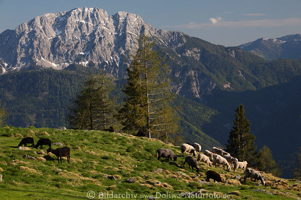 1202041. Schafe Hochalmweide Gebirge Bild grasen auf Bergwiese unter Gipfeln Felsen über Schluchtfreilaufende Hausschafe im Bergland Naturfoto weidende Schafsippe Fotografie Gebirgsschafe Gruppenbild Wollschafe grasende Tierherde |