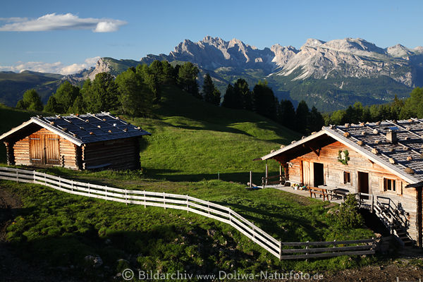 urige Holzhütten mit Zaun auf Bergwiese grüne Naturlandschaft in Abendstimmung Bild Foto vor Geislerspitzen, Gipfelblick auf Massiv Geislergruppe Felspanorama Naturfotografie am Blauhimmel, Südtirol Berge Hochplateau Naturidylle Urlaub im Alpenparadies Italiens Naturpark