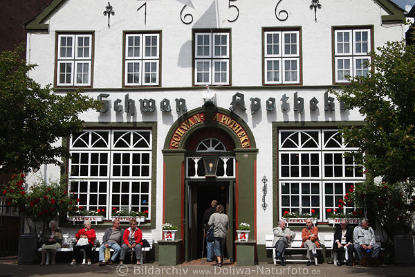 Stadtzentrum Apotheke im historisches Friesenhaus vom Jahre 1656 in der Großstrasse-Norderstrasse Reisefoto mit Besucher (friesisch Hüsem) Urlauber
