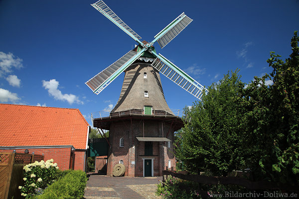 Windmühle Die Mühlentechnik der historischen Peldemühle von 1796 ist noch im urprünglichen Zustand und aktuell noch voll funktionsfähig bis 1996 ist sie noch im gewerblichen Betrieb gewesen hier in Emsland Fotografie unter Blauhimmel Rheiderland, Ostfriesland Reiseort nah Leer