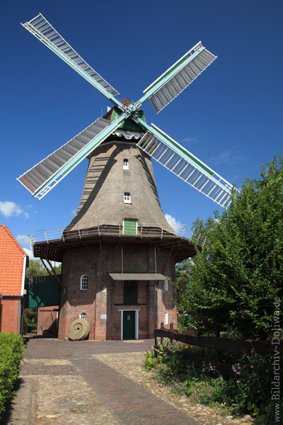 Galerieholländer Mühle rote Häuser Backsteinbau Dorfbild Rheiderland Emsregionam Dollart in Ostfriesland